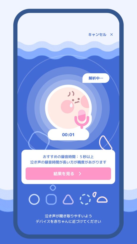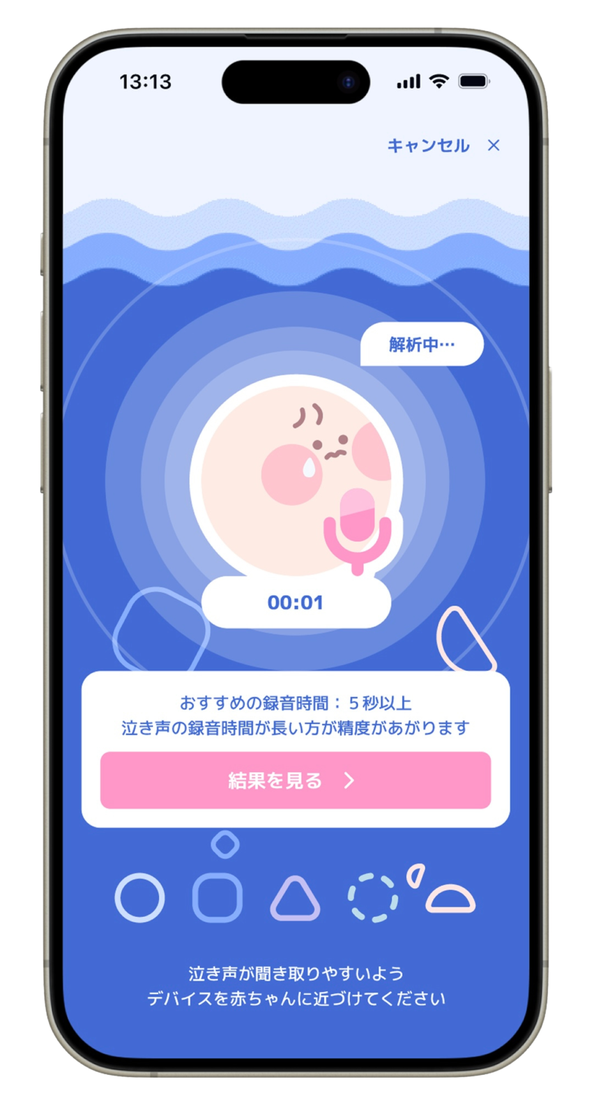 録音した泣き声をAIが分析し、感情を推定。「空腹」「眠い」「不快感」などの可能性をスコアで表示します。