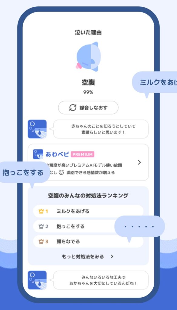 有料版(あわべビプレミアム)では、感情数が5→10に増え、ポイントなしで高精度なAIによる感情推定が可能になります。