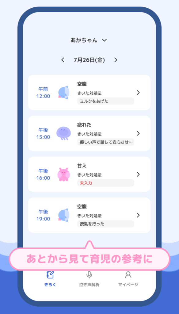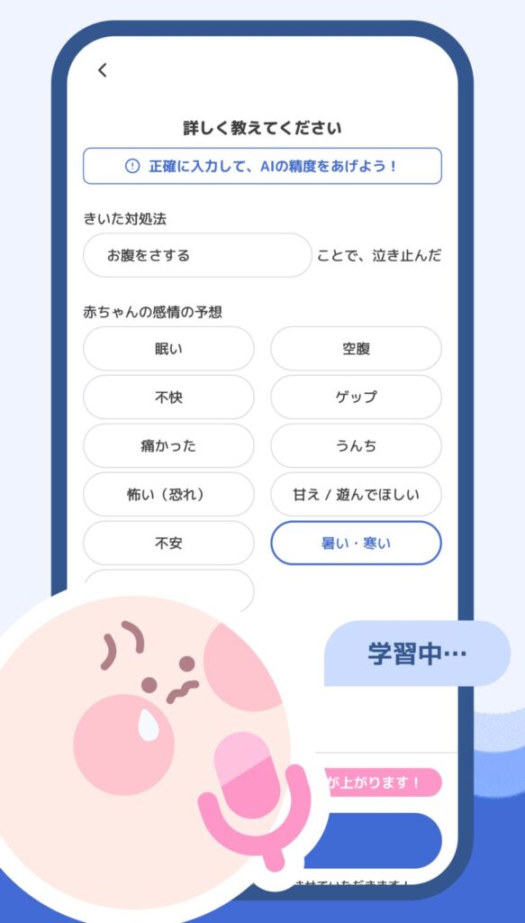 泣いた時間・理由を記録して育児のヒントに。対処法を記録すれば、AIの精度が上がります。